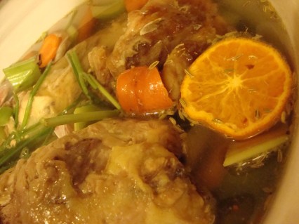 Put turkey, ham, onion, parsnip, orange, carrots, garlic into a slow cooker and add about 10 C water. Cover and cook on high for 3-4 hours. Turn to low and cook for 5-10 hours more. (I’ve actualy done 24 and it is great). During the last hour, add the spices. Strain broth several times through sieves and cheesecloth.