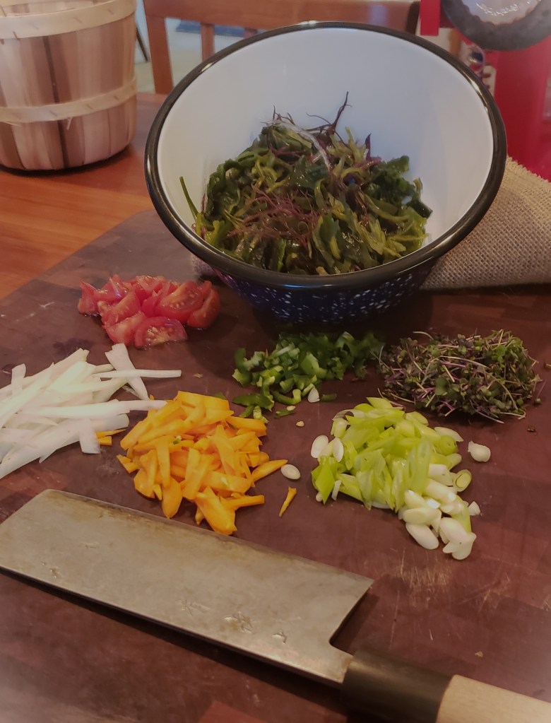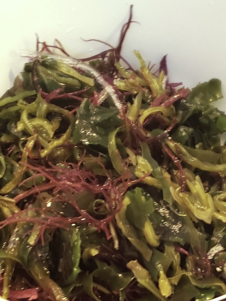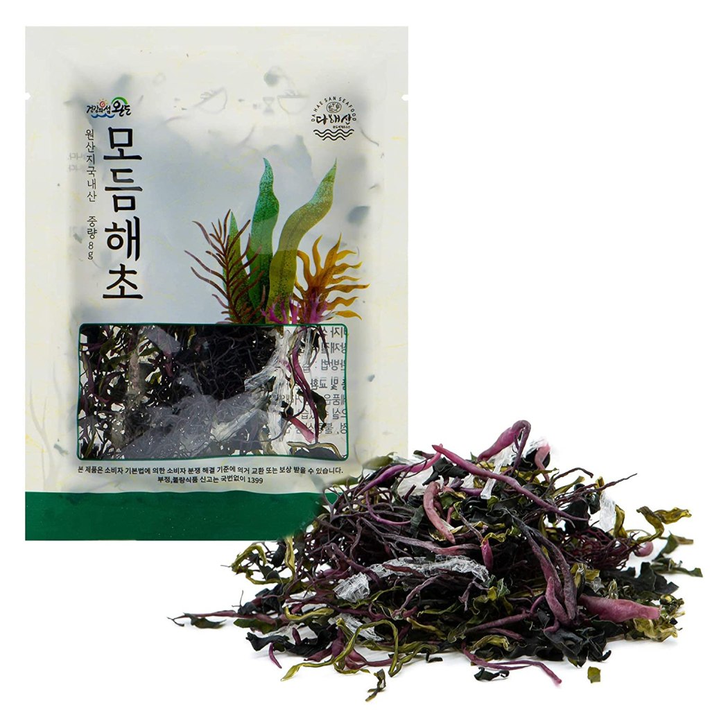 I’ve been buying this Jeollannamdo brand of dried seaweed (on Amazon) for several years.  There are no directions in English on the single serving packets, so not wanting to learn Korean, I’ve been freestyling it.  What follows is my basic seaweed salad recipe/method.  I think this will work with just about any dried seaweed mixture.  (Note, some dried seaweed must be blanched in boiling water for 6 seconds.)  The recipe that follows is for ready to hydrate seaweed.
