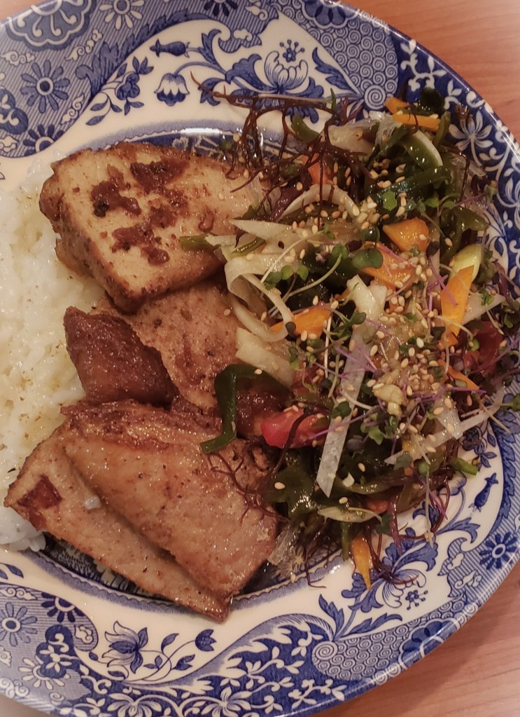 You can add any number of veggies to this:  cucumbers, corn, green peas, etc.  I like to serve some Siracha sauce with this as well.  Goes great with buckwheat noodles for a cold noodle/seaweed salad.  The pictures I’ve posted show it served with sushi rice and a 5 spice pork loin.