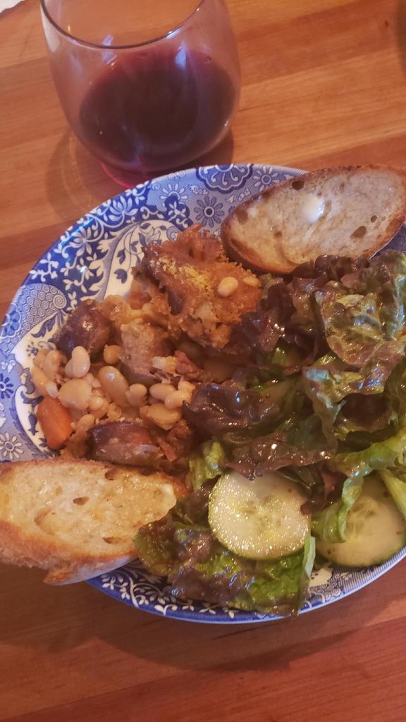 The cassoulet hails from Southern France. It is named after the dish in which it is cooked—cassolo, most often a deep cooking pot with a lid. Apparently, there as many “authentic” cassoulet recipes as there are individual communities in Southern France, with different regions featuring different meats depending upon their availability. This version is more like the one cooked in Toulouse in the Occitanie region.